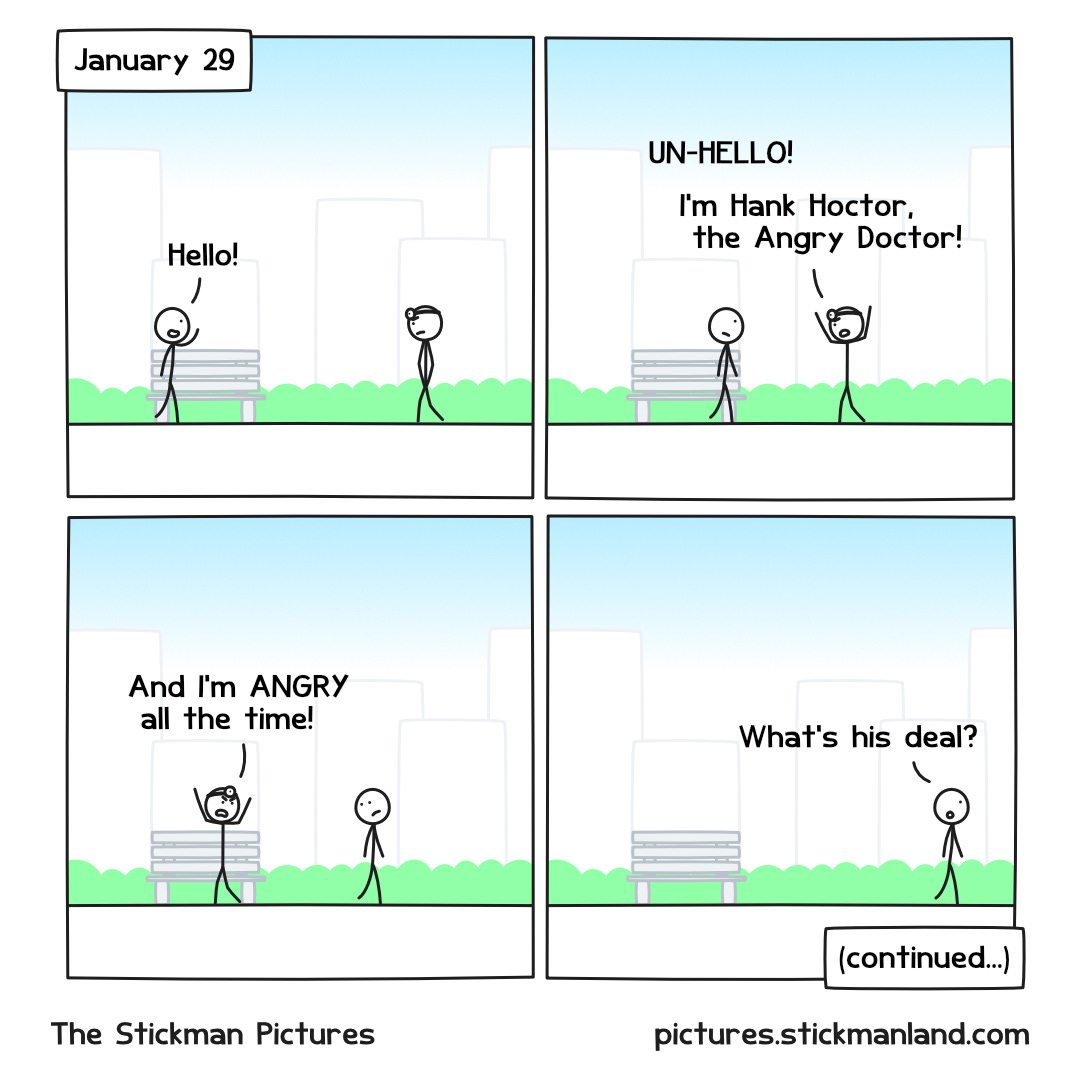 StoriesHank Hoctor, Angry Doctor: Page 1A new daily micro-story!Logan LeeJan 29, 20251ShareNext PageThis is Hank Hoctor, Angry Doctor, a new daily micro-story out of nowhere.Okay, stick with me here. Next one’s tomorrow!SubscribePreviousNext